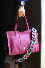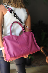Versión grande de crossbody estilo tote con asa larga removible para el hombro o cruzada. Interior en gamuza con un compartimiento de cierre y dos adicionales a un costado.